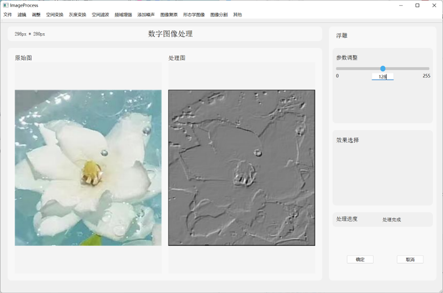 - 灰度化:将彩色图转换为灰度图,以便进行浮雕处理。