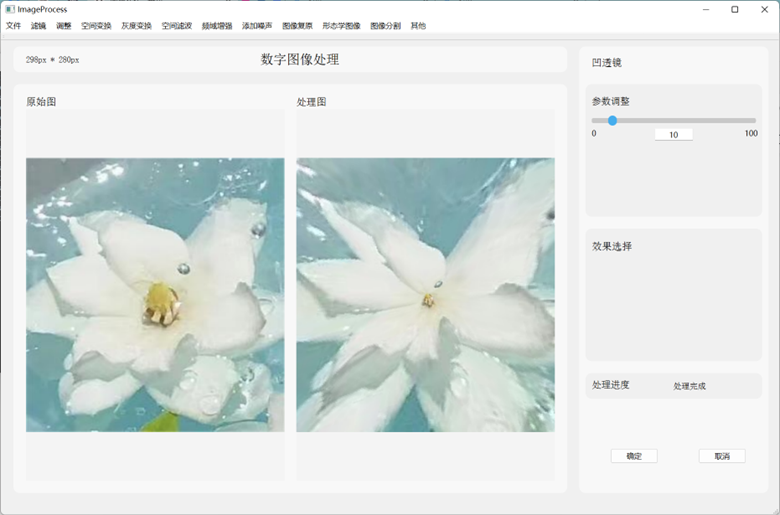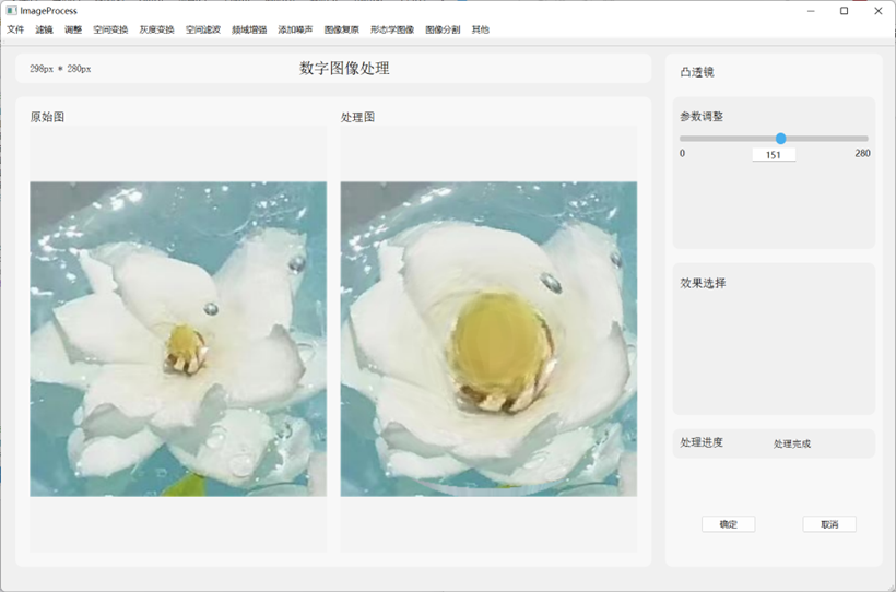 原理:当使用凸透镜中心观察一幅图像时,被观察的图像域将按照一定比例进行放大;相应地,这个区域的周围区域将被压缩。如果目标图像中的某一个像素与目标图像中心之间的距离的平方不大于凸透镜的半径的平方(两个整数进行比较,保证比较结果的精确度),就使用映射函数对这个像素的横、纵坐标进行映射处理。