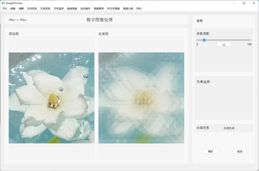 原理:将图像创建四个相互偏移的副本,叠加之后产生类似重影的效果。偏移方向为左上,左下,右上,右下,偏移角度为45度。将四个方向的偏移量累加求平均值作为中心点像素的值。各个方向的偏移量可以相同也可以不同。先来看相同的情况。