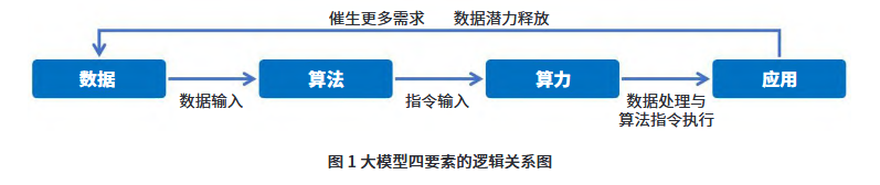 大模型的成功发展离不开数据、算力、算法和应用这四大要素的协同作用。