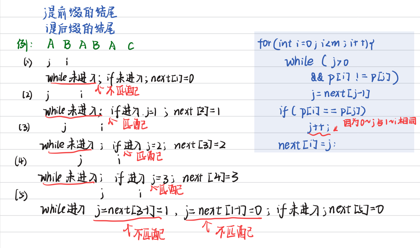 A(前缀无):Next[0]= 0AB(前缀A, 后缀B, 不等):Next[1]= 0ABA(前缀A, 后缀A, 相等):Next[2]= 1ABAB(前缀AB, 后缀AB, 相等):Next[3]= 2ABABC(前缀AB, 后缀BC, 不等):Next[4]= 0