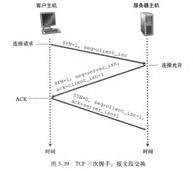 SYN标志位被置为1,同时包含一个随机生成的初始序号(client_isn)。 - SYN + ACK:服务器接收到 SYN 报文段后,为该连接分配资源,并向客户端发送一个 SYNACK 报文段。该报文段的